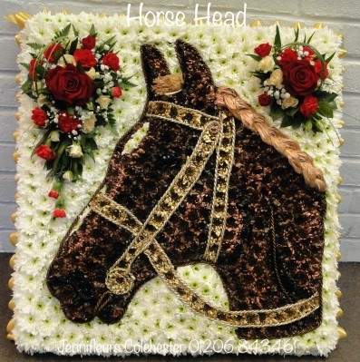 At Jennifleurs we are extremely proud of our very personal floral tributes. This realistic horse head design was created by our head florist Kathryn. With her many years of design experience Kathryn is uniquely talented at bringing these particular designs to life. This horses head design measures 2ft x 2ft and is available to order for delivery in and around the Colchester area or collection can be arranged from our shop premises.