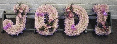 Traditional letter tribute shown here in pink and purple. Please call or email for more details