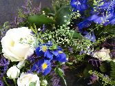 Designer country style wreath in blue and white. Designed and made by one of our talented florists at Jennifleurs. Please insist on seeing examples of a florists own work when ordering floral tributes online. Avoid websites with fancy studio enhanced or stock images as this may lead to disappointment. Funeral flowers available for delivery daily in and around Colchester. All our floral tributes are made to order by one of our expert florists at Jennifleurs Colchester and delivered by hand to any of our local funeral directors or the home address if you prefer. Daily delivery to Hunnaball Funeral Service, John J Smiths, Colchester and East of England Coop Wimpole Road, Sherpherds Funeral Service and all other Colchester undertakers.