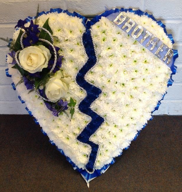 Broken heart funeral tribute in blue and white. Silver letter wording will not be included unless stated during the checkout process. Funeral flowers are available for delivery daily in and around Colchester. All our floral tributes are made to order by one of our expert florists at Jennifleurs Colchester and delivered by hand to any of our local funeral directors or the home address if you prefer. Daily delivery to Hunnaball Funeral Service, John J Smiths, Colchester and East of England Coop Wimpole Road, Shepherds Funeral Service and all other Colchester undertakers.