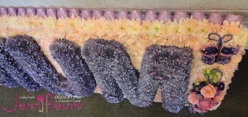 Unique 3D effect MUM funeral flowers. This beautiful floral tribute has been designed and made by one of our talented florists at Jennifleurs. As with all our special funeral flowers this design has been made pictured by us at Jennifleurs. Delivery is available throughout the Colchester and surrounding area or you are welcome to collect from our shop in Colchester. To avoid disappointment please insist on seeing images of a florist own work if ordering this tribute elsewhere, design skills and floristry techniques can vary enormously from florist to florist.