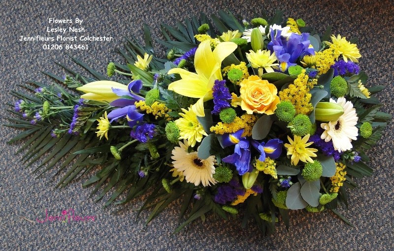 Striking funeral spray in blue, mauve and yellow. Expertly arranged in florists foam by one of our talented florists at Jennifleurs Colchester this floral tribute will arrive freshly made and have a water source to ensure it looks stunning for as long as possible. Delivery is available to any of our local funeral directors - Hunnaball of Colchester, Coop Funeral Service Wimpole Road, John J Smiths, Freedom Funerals, Shepherds Funeral Service, Gwinnells Funeral Service or to any address in the Colchester area. You will be invited to add a personal message to go along with your flowers during the checkout process, please take a moment to consider this before placing your order as it can be difficult to do so on the spot. All our floral tributes are made to order at Jennifleurs and delivered by hand, if you have any special requirements regarding delivery or the size and colour of this tribute please give us a call, our experienced florist will be happy to help and advise 01206 843461.