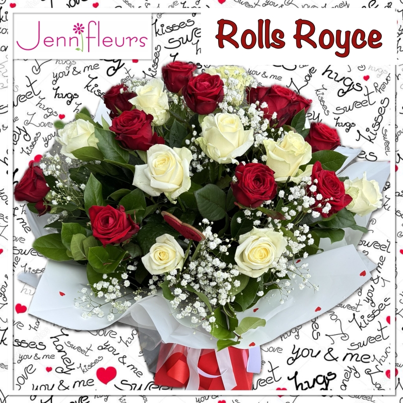 “ROLLS ROYCE” As it’s name suggests, classic, classy and luxurious. Our ROLLS ROYCE features 20 premium roses, 10 pure white and 10 rich red. Nestled within an array of beautiful foliages and tastefully packaged with tiny heart details.